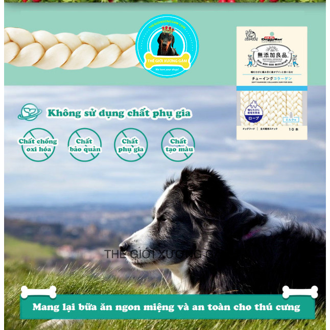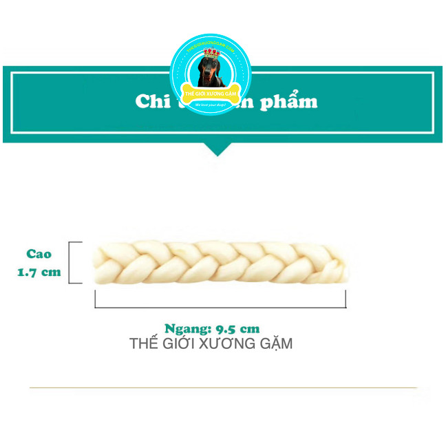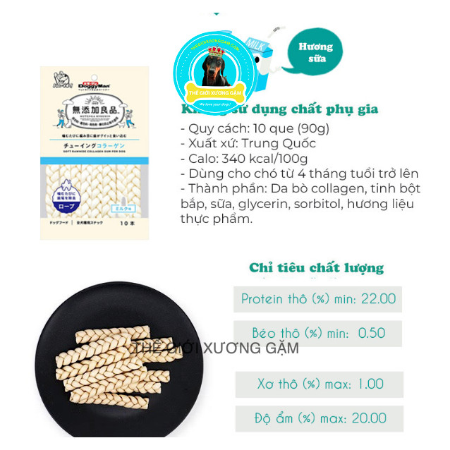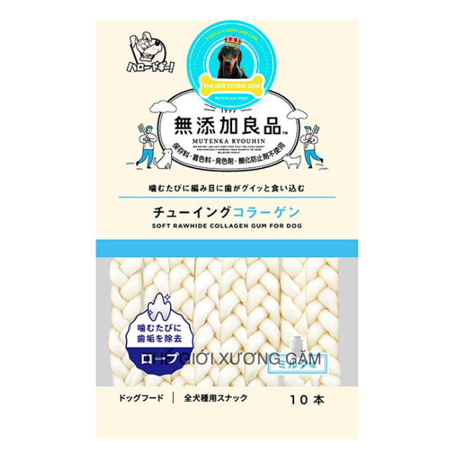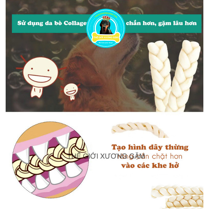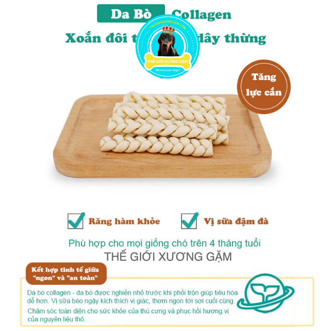 "Da bò collagen" được thắt thành hình dây thừng. Dễ dàng lấy mảng bám trên răng. Dây bền chặt, nhai lâu, tăng cường sức khỏe răng hàm. Hương sữa thơm ngon khó cưỡng.