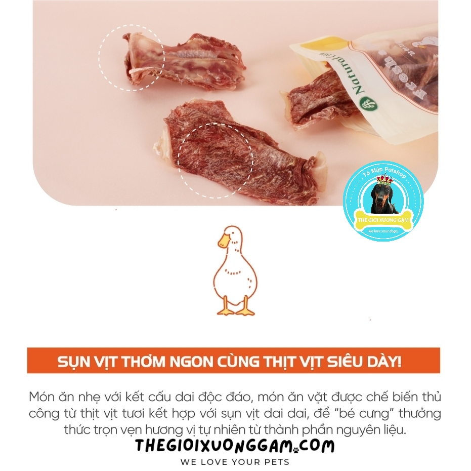 Sử dụng 100% thịt vịt tươi và sụn vịt đạt tiêu chuẩn dành cho người, tạo nên món ngon từ hương vị tự nhiên.