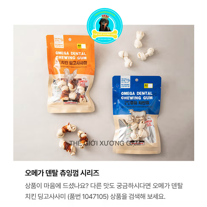 Nếu bạn lo lắng về sức khỏe răng miệng của chó và không muốn cho các bé ăn xương da bò, hãy thử cho chúng ăn kẹo cao su Omega Dental Milk Chicken. Sản phẩm này ngăn ngừa cao răng cứng và giảm căng thẳng bằng cách nhai và gặm.