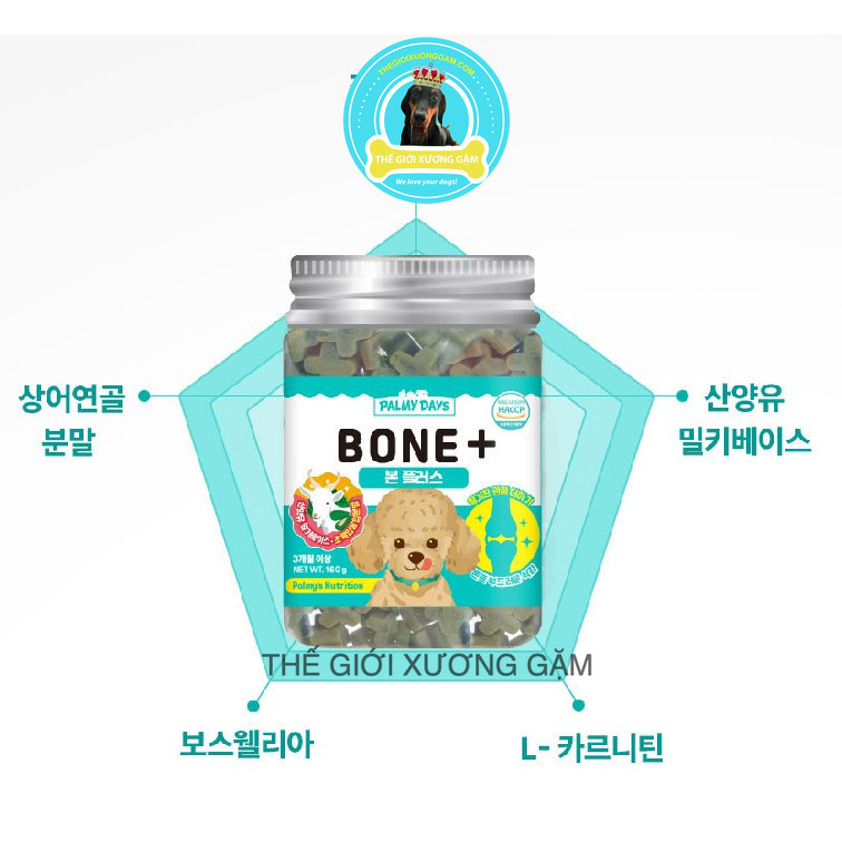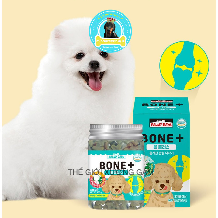 Palmy Days Bone Plu là sản phẩm bổ sung glucosamine và chondroitin—thích hợp cho chó con, chó lớn tuổi hoặc các bé cần nâng cao sức khỏe. Viên nhai mềm, hương vị tự nhiên, dễ dùng, nguồn gốc xuất xứ Hàn Quốc – là lựa chọn tối ưu để chăm sóc hệ miễn dịch và phát triển toàn diện cho thú cưng.